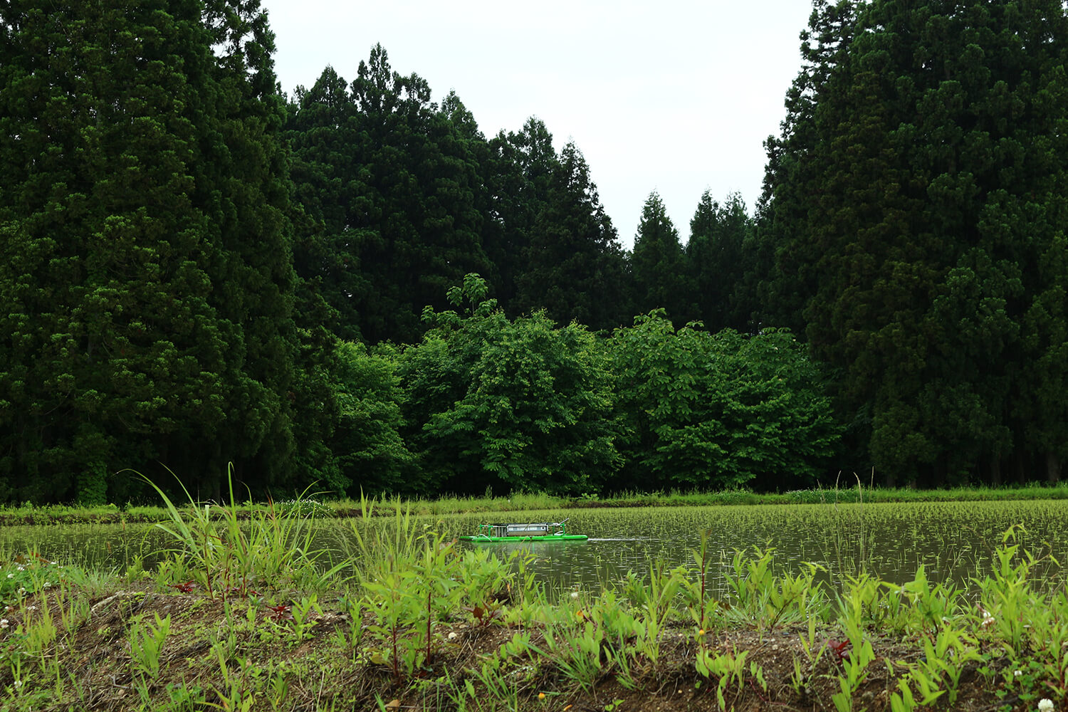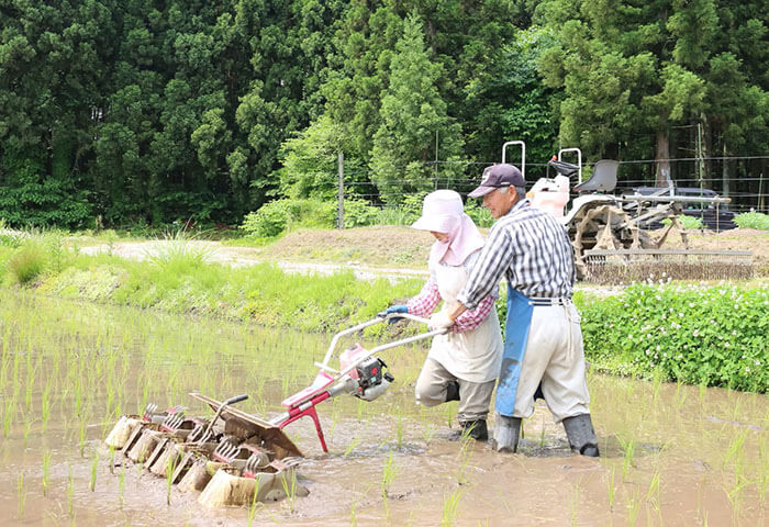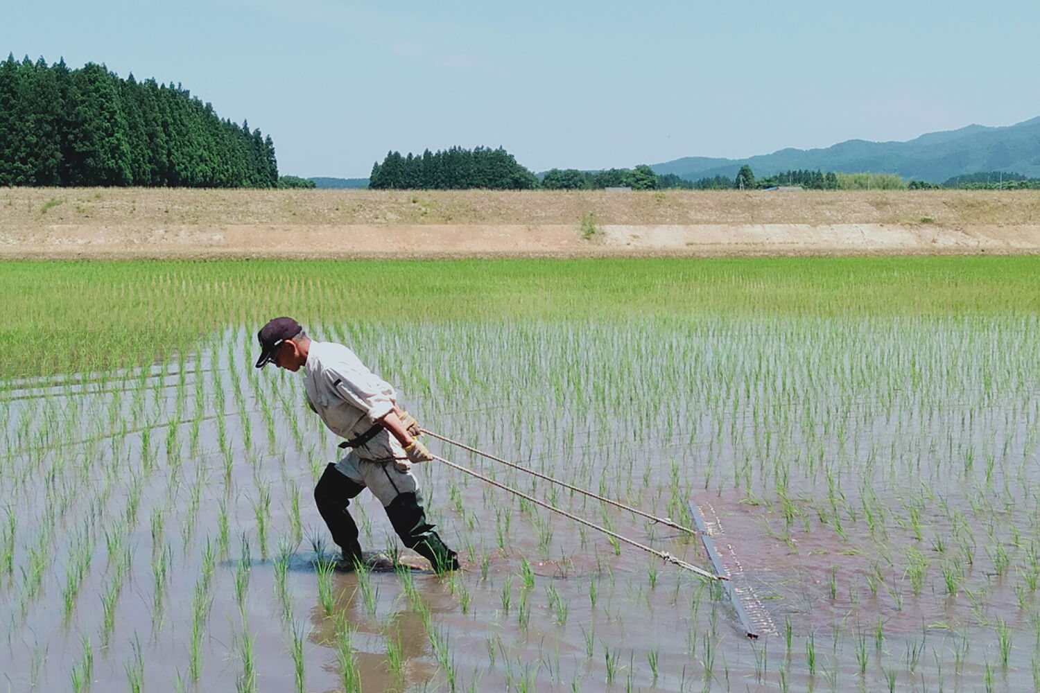 自然栽培のお米は、「チェーン除草」、「カルチ除草」といった農薬に頼らない方法を組み合わせて除草している。